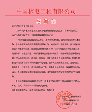 12月4日,大連寶原核設備有限公司收到來自方家山現場項目部的感謝信.